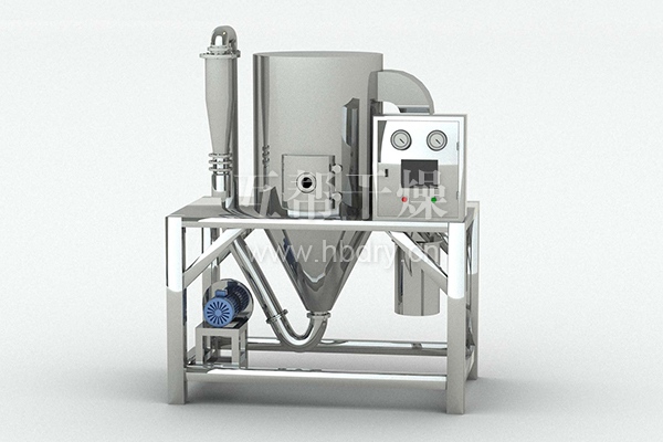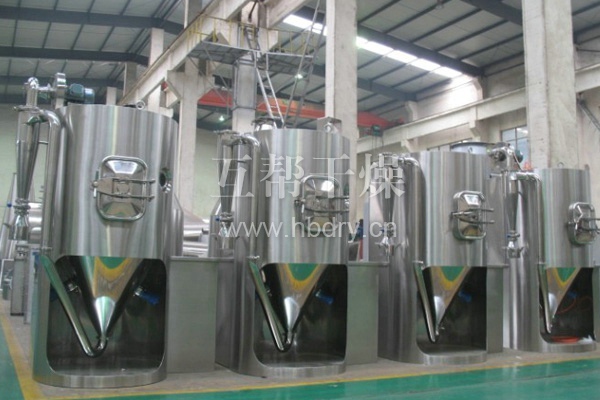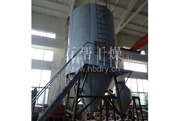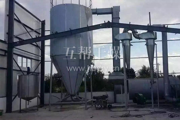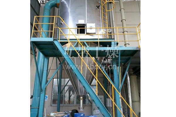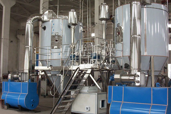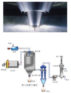 空氣經(jīng)過過濾和加熱,進入干燥器頂部空氣分配器,熱空氣呈螺旋狀均勻地進入干燥室。料液經(jīng)塔體頂部的高速離心霧化器,(旋轉)噴霧成極細微的霧狀液珠,與熱空氣并流接觸,在極短的時間內可干燥為成品。成品連續(xù)地由干燥塔底部和旋風分離器中輸出,廢氣由風機排空。
